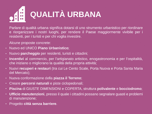 Un unico Piano, che includa ed abbia una visione complessiva dell’intero territorio urbano: Centro Storico e, centro abitato, campagna e zone commerciali e produttive. Questa è di fatto una scelta irrinunciabile ed irrimandabile, un passaggio fondamentale. Perché al di là di ogni proposta, progetto, promessa, è qui, in questo “strumento”, che si guida, governa, incentiva il cambiamento, quello reale, la valorizzazione ed il rispetto per il nostro paesaggio. Tutto il resto sono belle e semplici parole. Da sempre consideriamo l'urbanistica lo sviluppo del territorio, quindi solo da qui possiamo programmare la Corinaldo del 2030 del 2040, Corinaldo del domani e dopodomani. Parlare di qualità urbana significa dotarsi di uno strumento urbanistico per riordinare e riorganizzare i nostri luoghi, per rendere il Paese maggiormente vivibile per i residenti, per i turisti e per chi voglia investire.